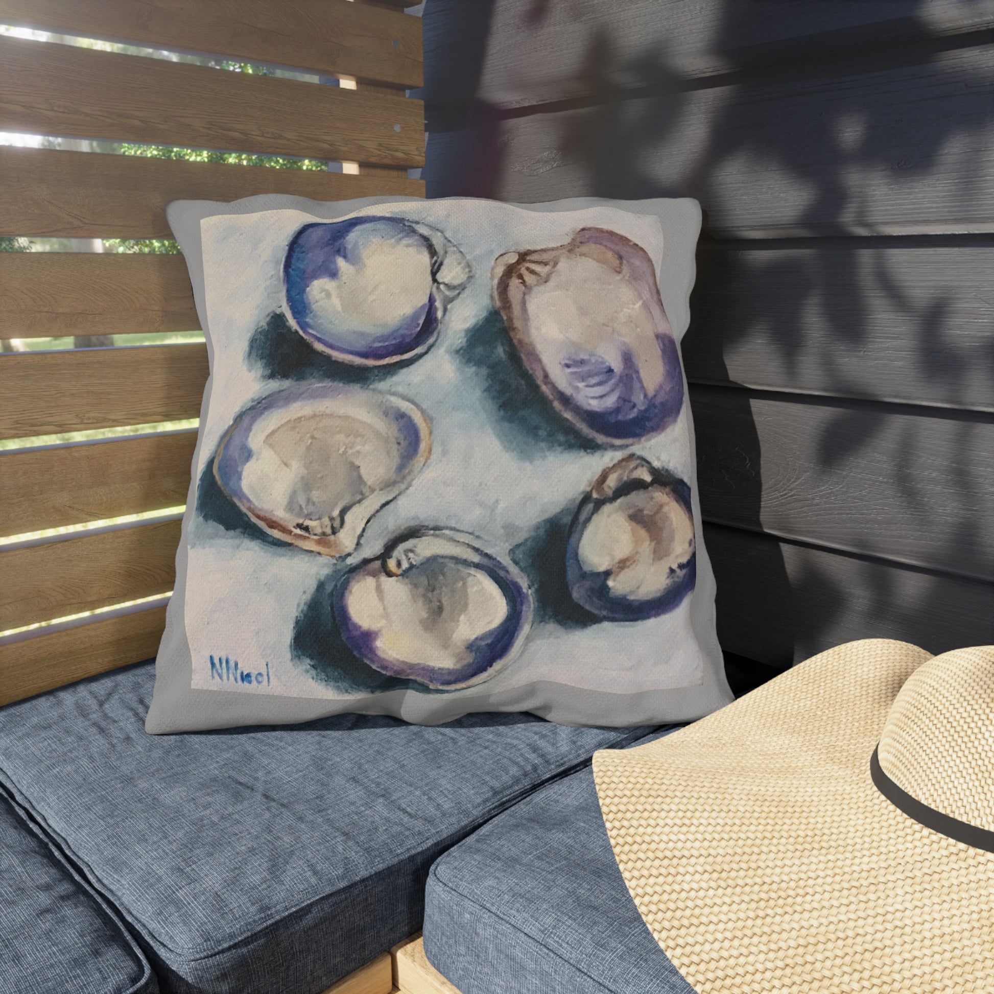 This pillow has a unique design by Cape Cod artist Nancy Nicol, featuring five Chatham clams. Perfect decor compliment for patio or pool area and for gifting or staging. It is UV-resistant so you can count on the colors being vibrant for a long time. Printed both sides. Additionally, it is water and mildew-resistant. Assembled in USA.