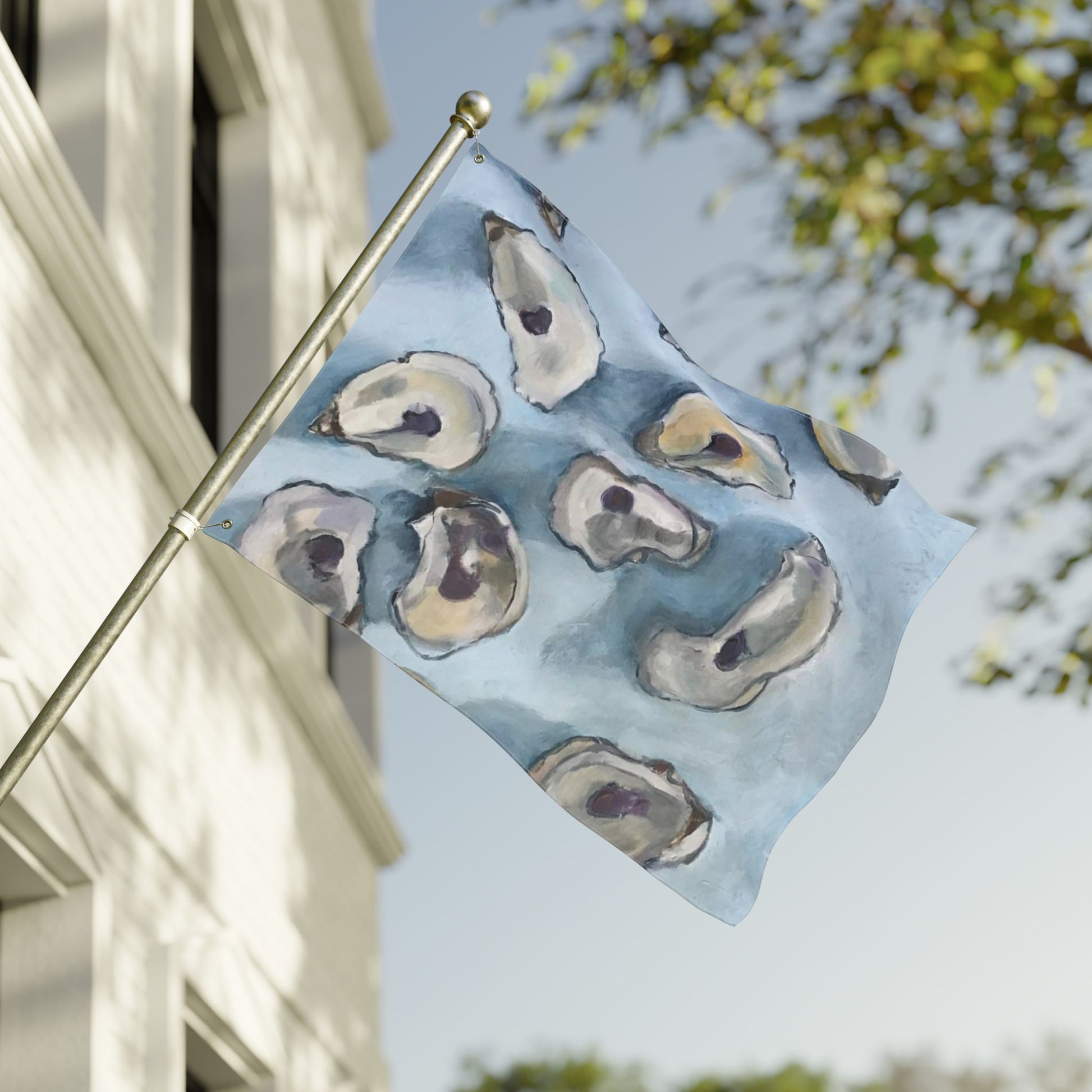 The Wellfleet Oysters flag is a stylish way to make a statement! Display your Wellfleet pride and spirit. Made from 100% durable polyester, it withstand the elements while maintaining vibrant colors and high visibility. Perfect for a variety of settings - home, yard, deck or for special events. It is lightweight. easy to fly. Reinforced edges ensure sturdy construction and longevity. USA.